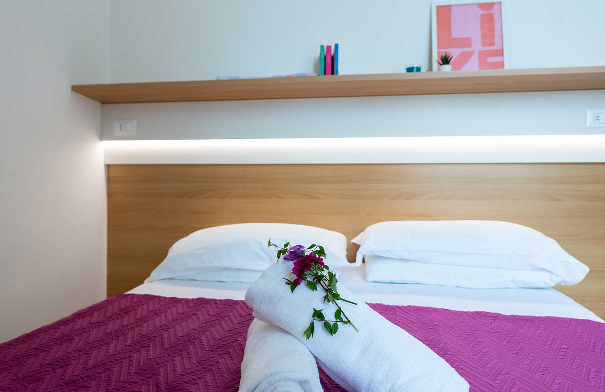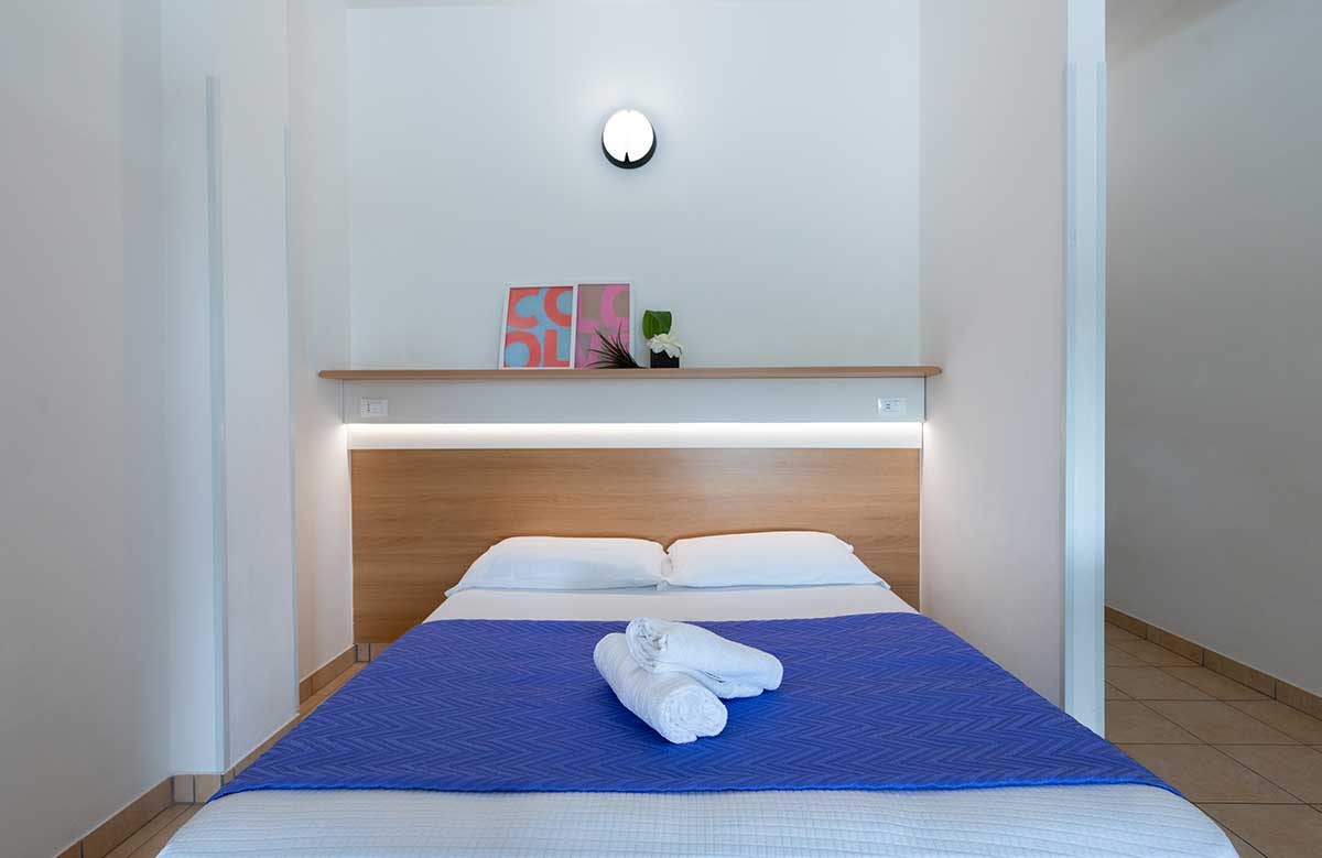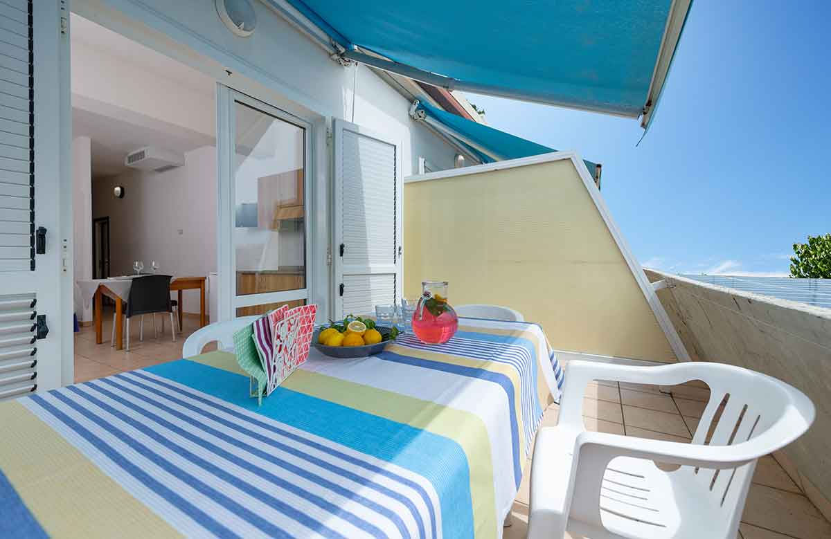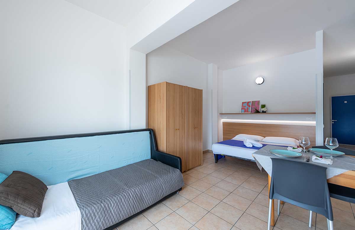 Die 2-Raum-Wohnung (ca. 55 qm) bietet Platz für bis zu 6 Personen. Sie besteht aus einem Doppelbettschlafzimmer, einem Wohnraum mit Kochecke (mit Besteck, Geschirr und Töpfen), 80 l Kühlschrank (mit Gefrierfach), 1 Doppelbett, Schlafsofa sowie einem Balkon mit Esstisch und Stühlen. Vollständig ausgestattetes Bad: Waschbecken, Duschkabine, Bidet, WC und Fön.