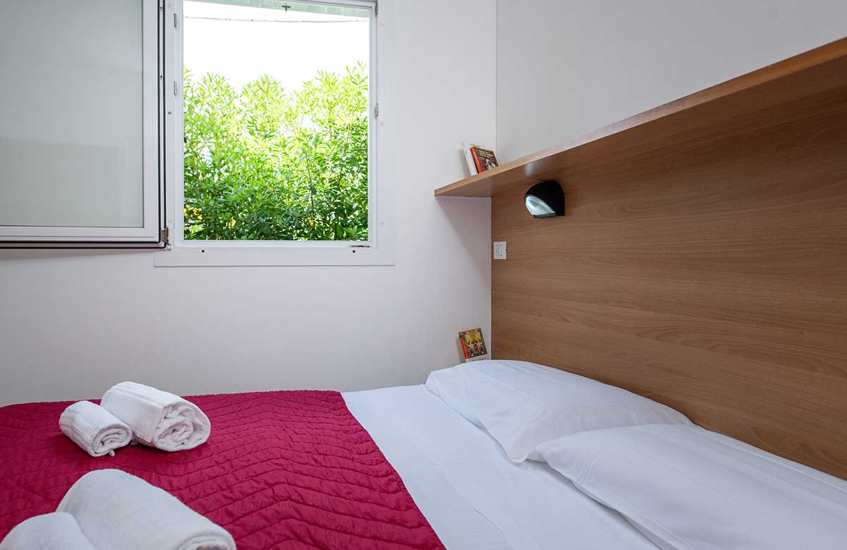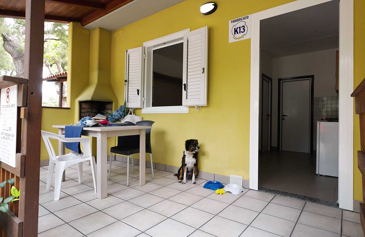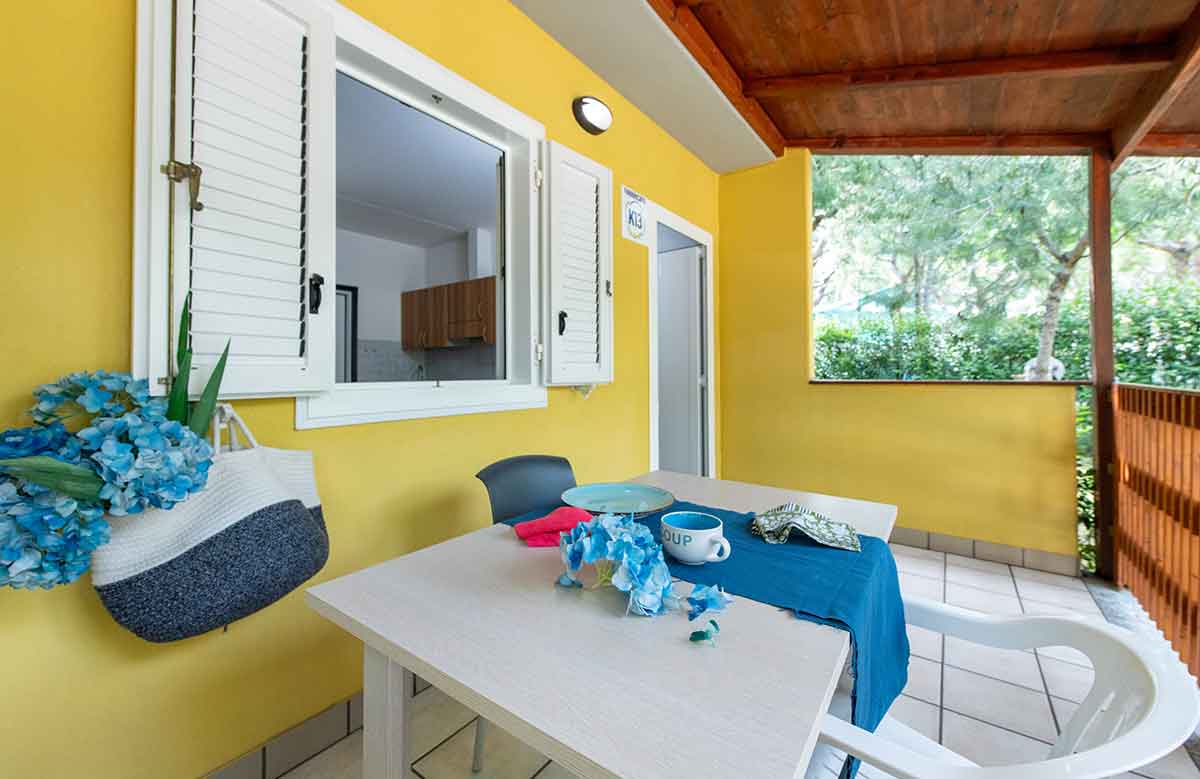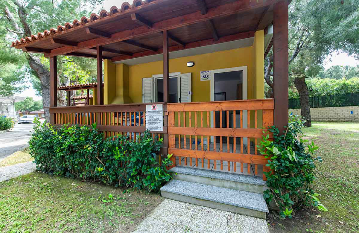 Er besteht aus einem Doppelbett-Schlafzimmer, einem Wohnraum mit Kochecke (mit Besteck, Geschirr und Töpfen), 80 l Kühlschrank (mit Gefrierfach), Schlafsofa sowie mit Esstisch und Stühlen ausgestatteter, Außenveranda mit Tor. Vollständig ausgestattetes Bad: Waschbecken, Duschkabine, Bidet, WC und Fön.