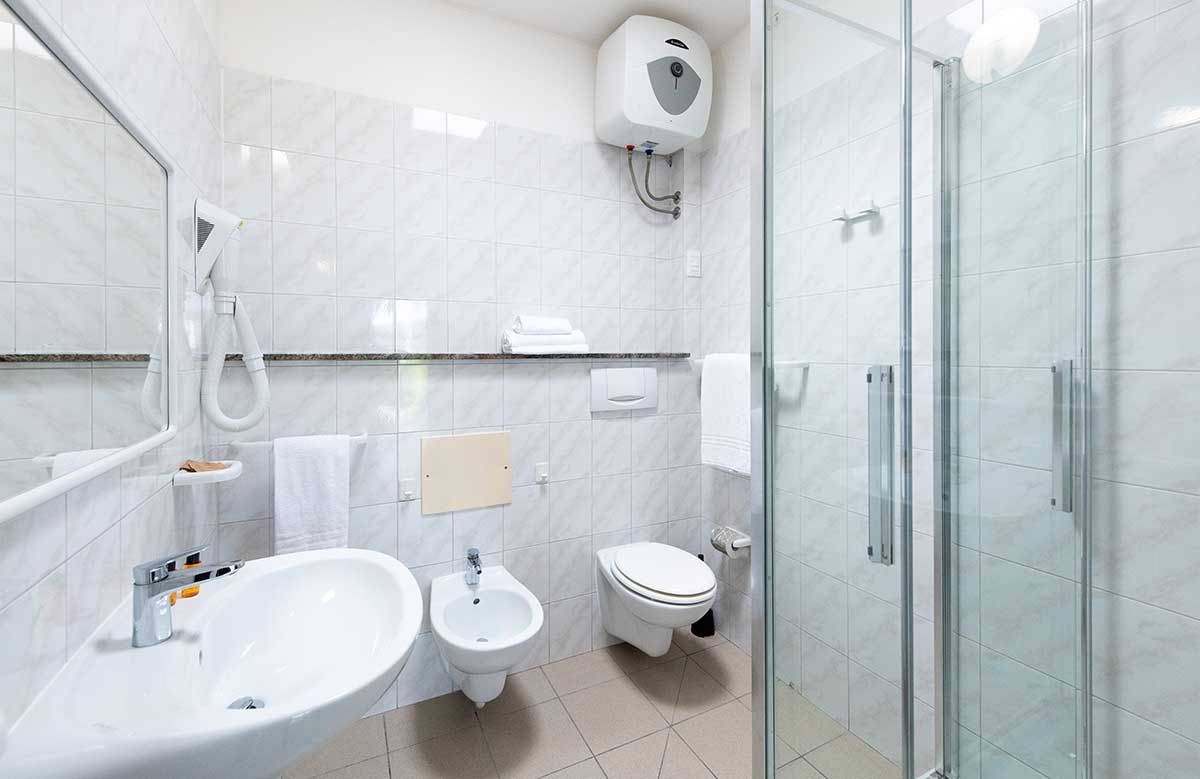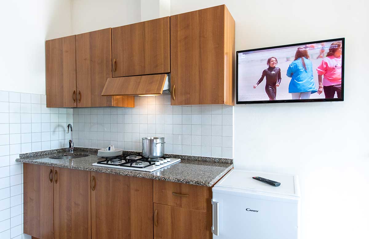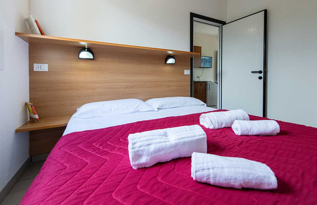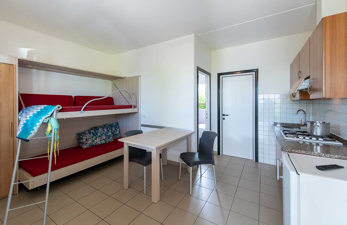 Er besteht aus einem Doppelbett-Schlafzimmer, einem Wohnraum mit Kochecke (mit Besteck, Geschirr und Töpfen), 80 l Kühlschrank (mit Gefrierfach), Schlafsofa sowie mit Esstisch und Stühlen ausgestatteter, Außenveranda mit Tor. Vollständig ausgestattetes Bad: Waschbecken, Duschkabine, Bidet, WC und Fön.