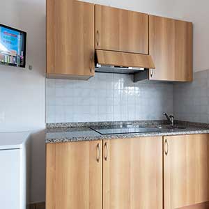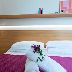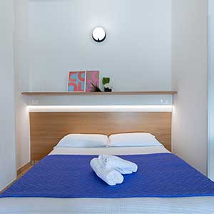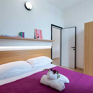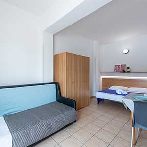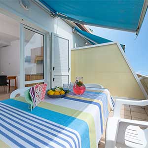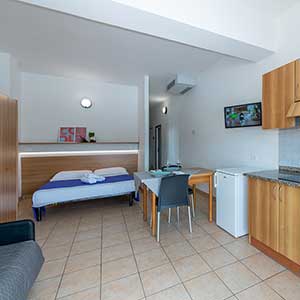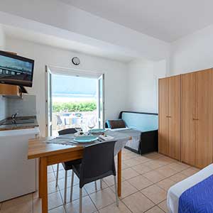 The two-room apartment (approx. 55 sq m) can accommodate up to 6 people. It consists of a double bedroom, living room with kitchenette (equipped with cutlery, cookware) 80 lt fridge (with freezer compartment), 1 double bed, sofa bed, and balcony furnished with dining table and chairs. Bathroom complete with all amenities: washbasin, shower cubicle, bidet, toilet and hairdryer.
