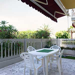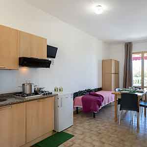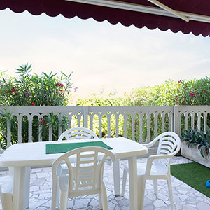 The two-room apartment (approx. 40 m2) can accommodate up to 5 people. It consists of a double bedroom, living room with kitchenette (equipped with cutlery, cookware) 80 litre fridge (with freezer compartment), 1 bunk bed + 1 single bed and veranda with table and 2 chairs. Bathroom with all amenities: washbasin, shower curtain, bidet, toilet.