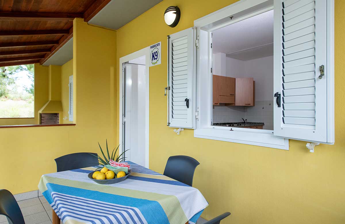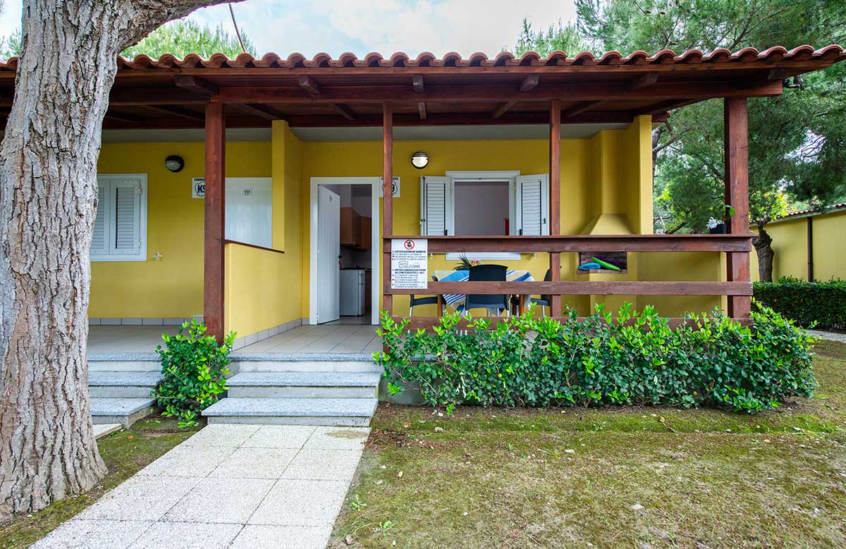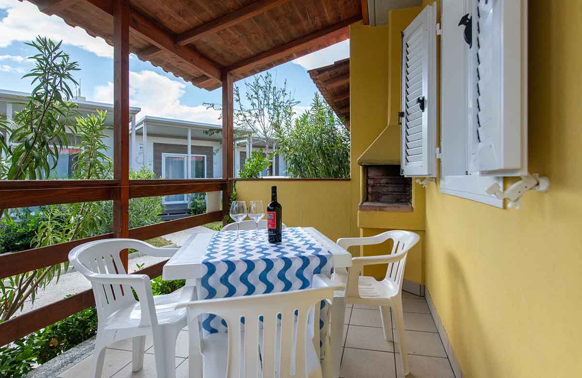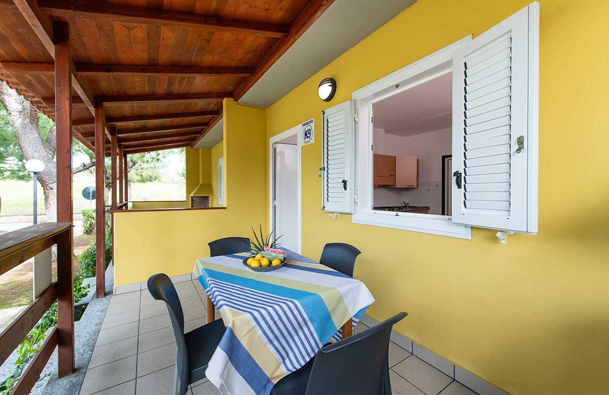 It consists of a double bedroom, living room with kitchenette (equipped with cutlery and cookware) 80-litre fridge (with freezer compartment), sofa bed, outside veranda furnished with dining table and chairs. Bathroom complete with all amenities: washbasin, shower cubicle, bidet, toilet and hairdryer.