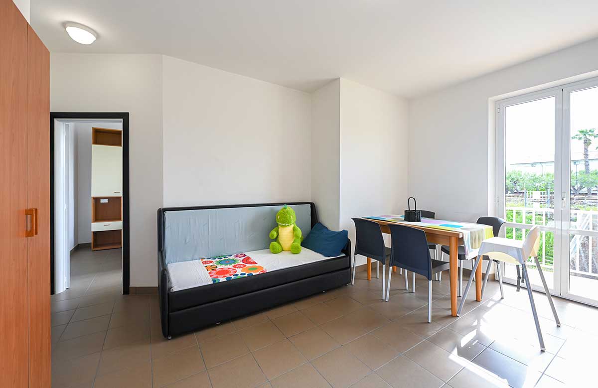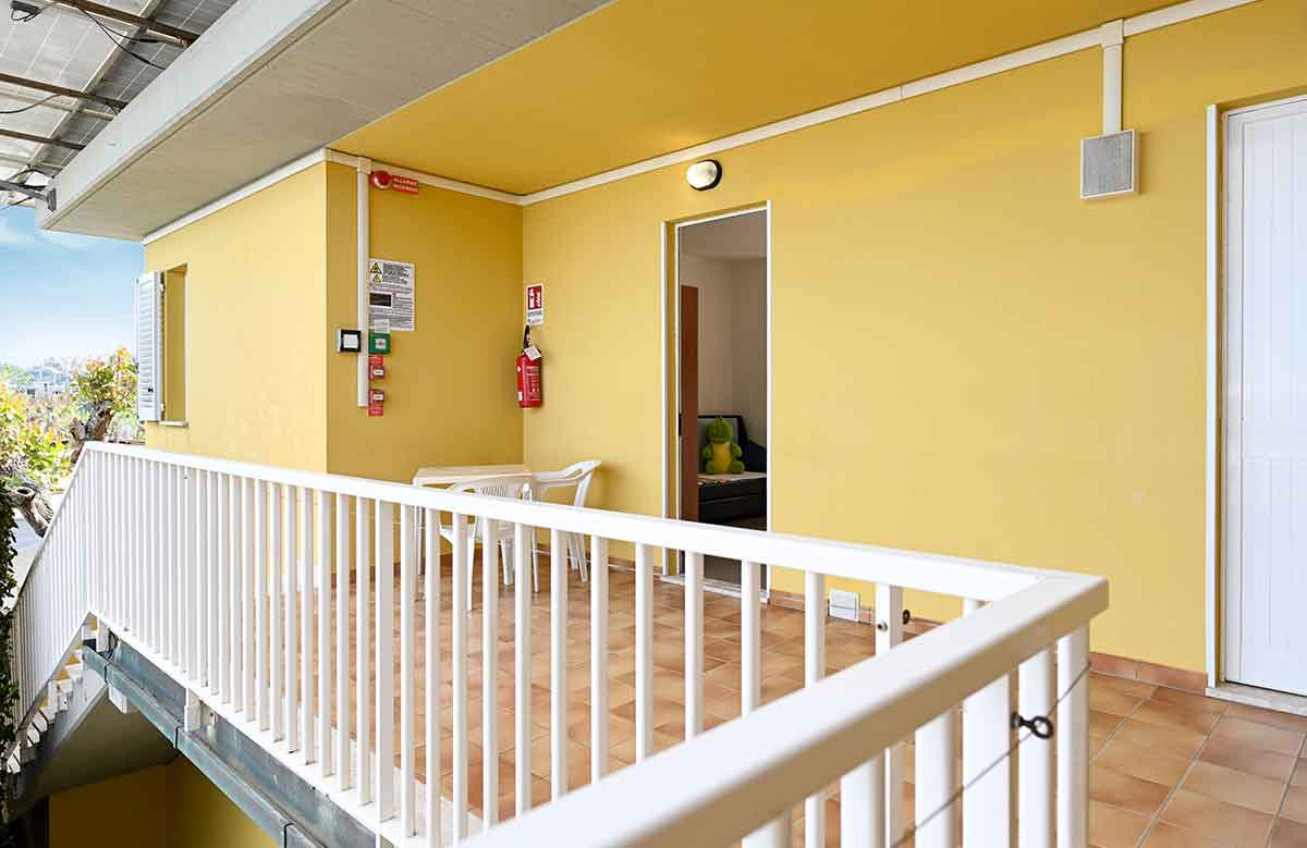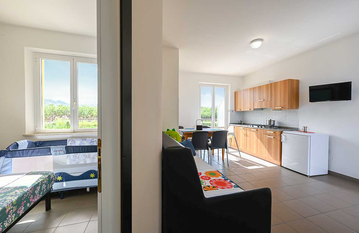 Il bilocale (circa 40 mq) può ospitare fino a 5 persone. E’ composto da una camera matrimoniale, soggiorno con angolo cottura (fornito di posate, stoviglie e pentolame) frigo 80 lt (con scompartimento freezer),1 divano componibile e terrazza condivisa arredata con tavolinetto e sedie. Bagno completo di tutti i servizi: lavabo, tenda doccia, bidet, wc.