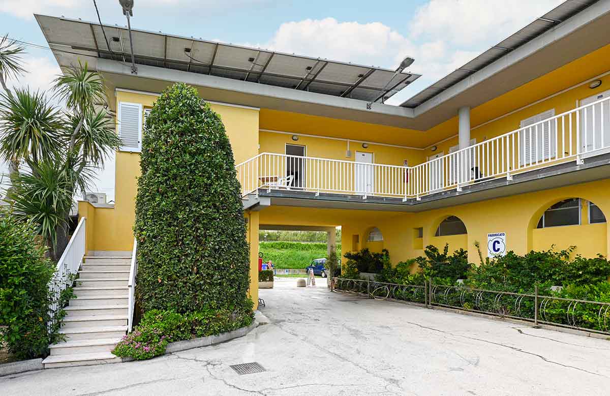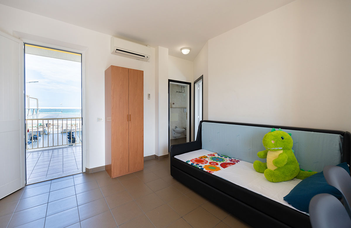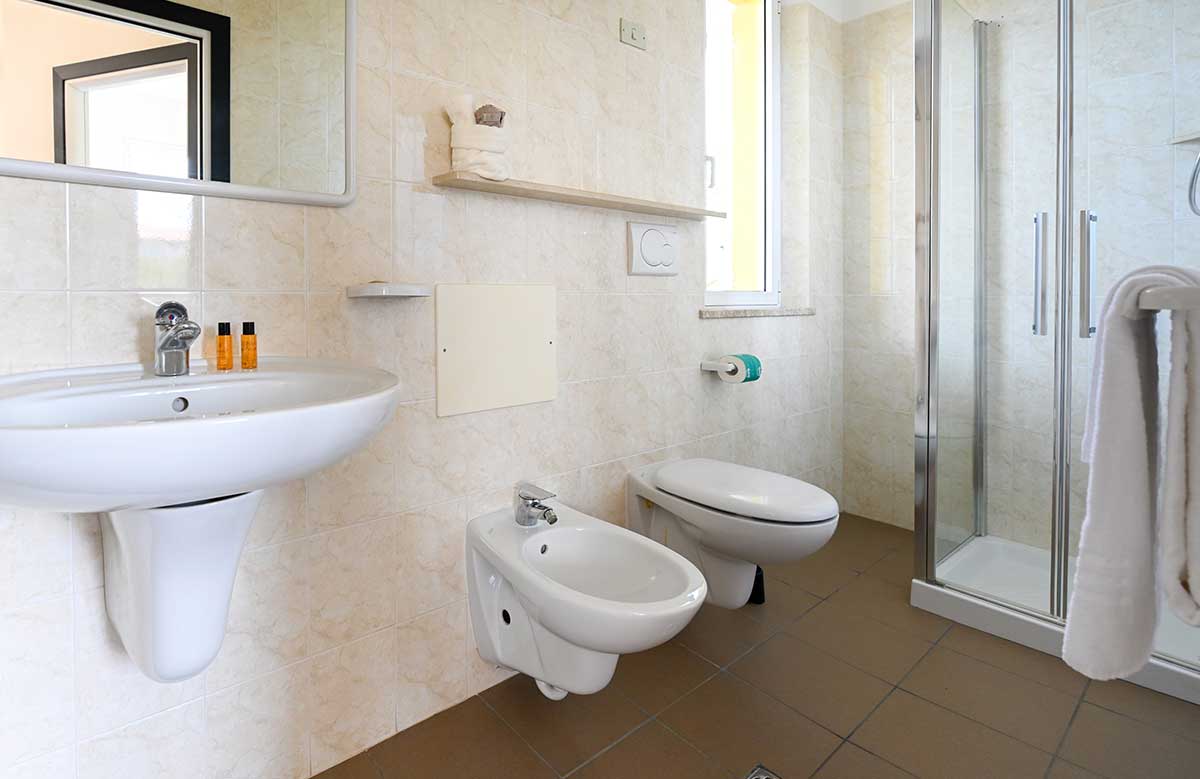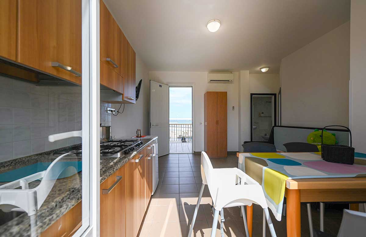 Il bilocale (circa 40 mq) può ospitare fino a 5 persone. E’ composto da una camera matrimoniale, soggiorno con angolo cottura (fornito di posate, stoviglie e pentolame) frigo 80 lt (con scompartimento freezer),1 divano componibile e terrazza condivisa arredata con tavolinetto e sedie. Bagno completo di tutti i servizi: lavabo, tenda doccia, bidet, wc.