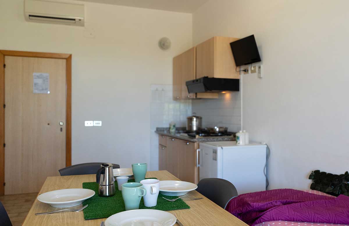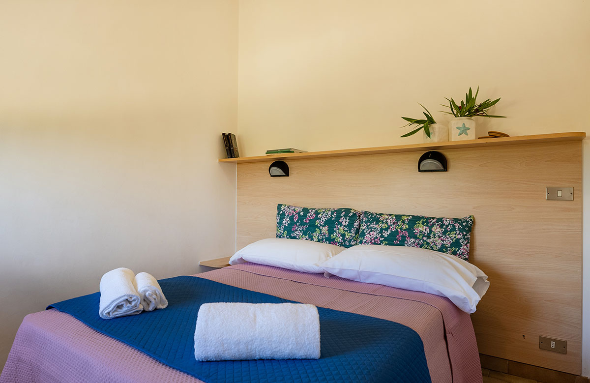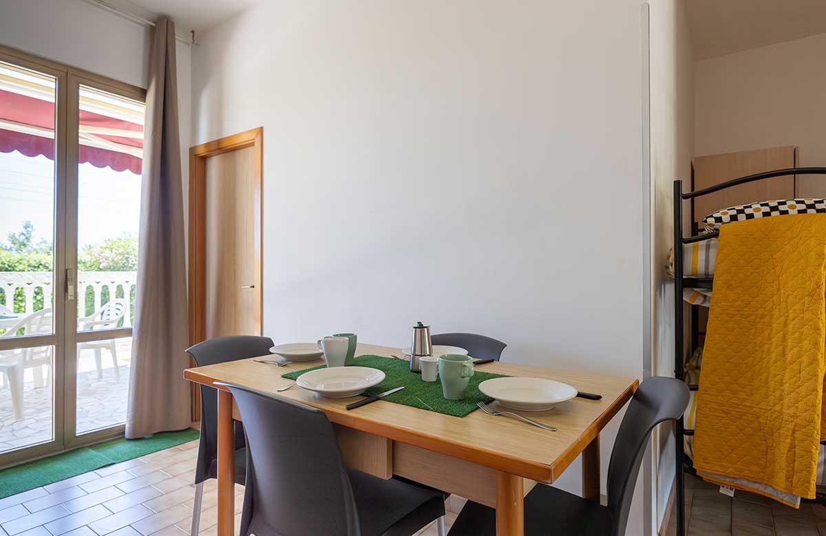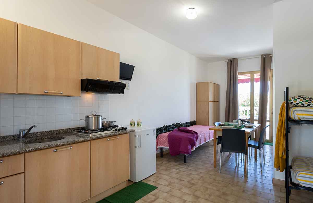 Il bilocale (circa 40 mq) può ospitare fino a 5 persone. E’ composto da una camera matrimoniale, soggiorno con angolo cottura (fornito di posate, stoviglie e pentolame) frigo 80 lt (con scompartimento freezer),1 letto a castello + 1 letto singolo e veranda con tavolo con 2 sedie. Bagno completo di tutti i servizi: lavabo, tenda doccia, bidet, wc.