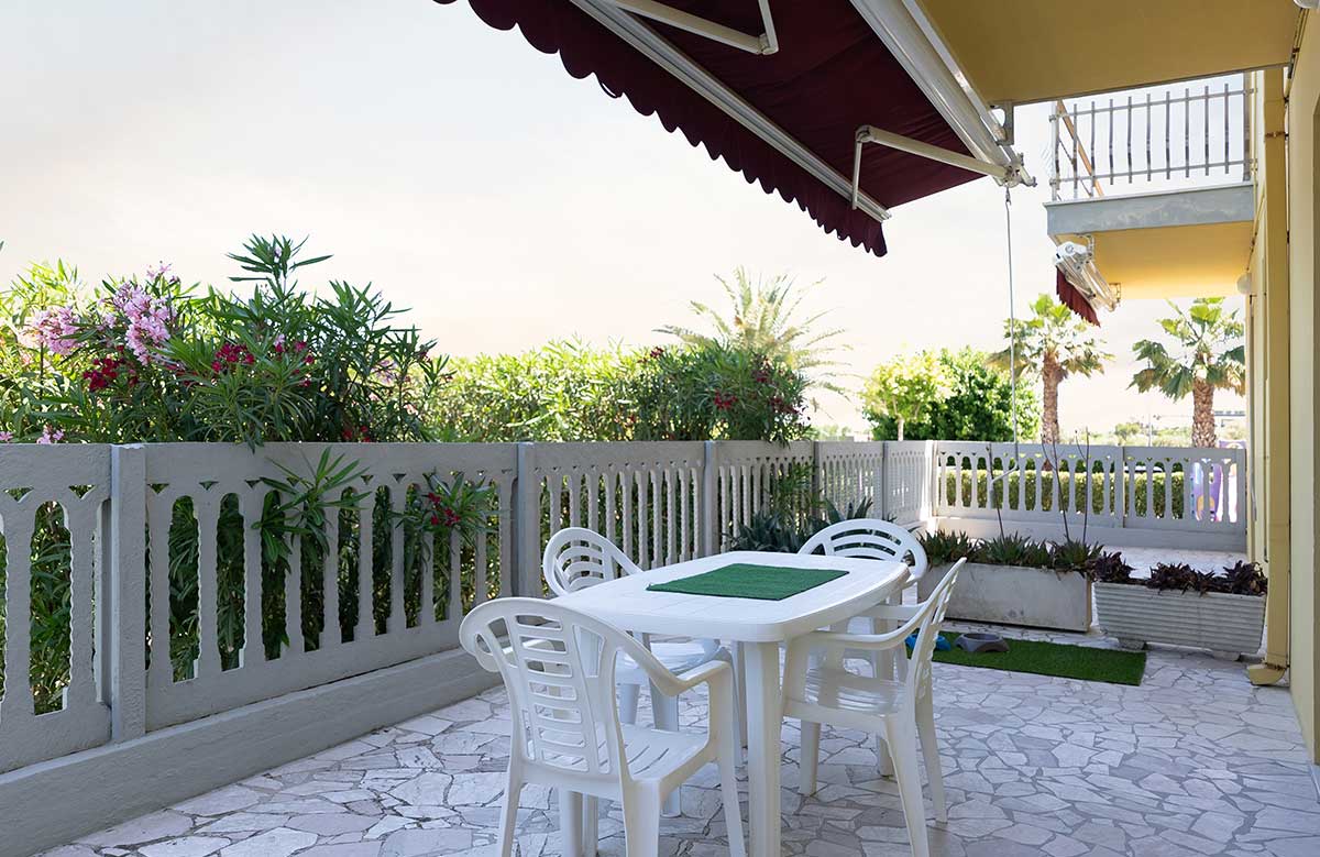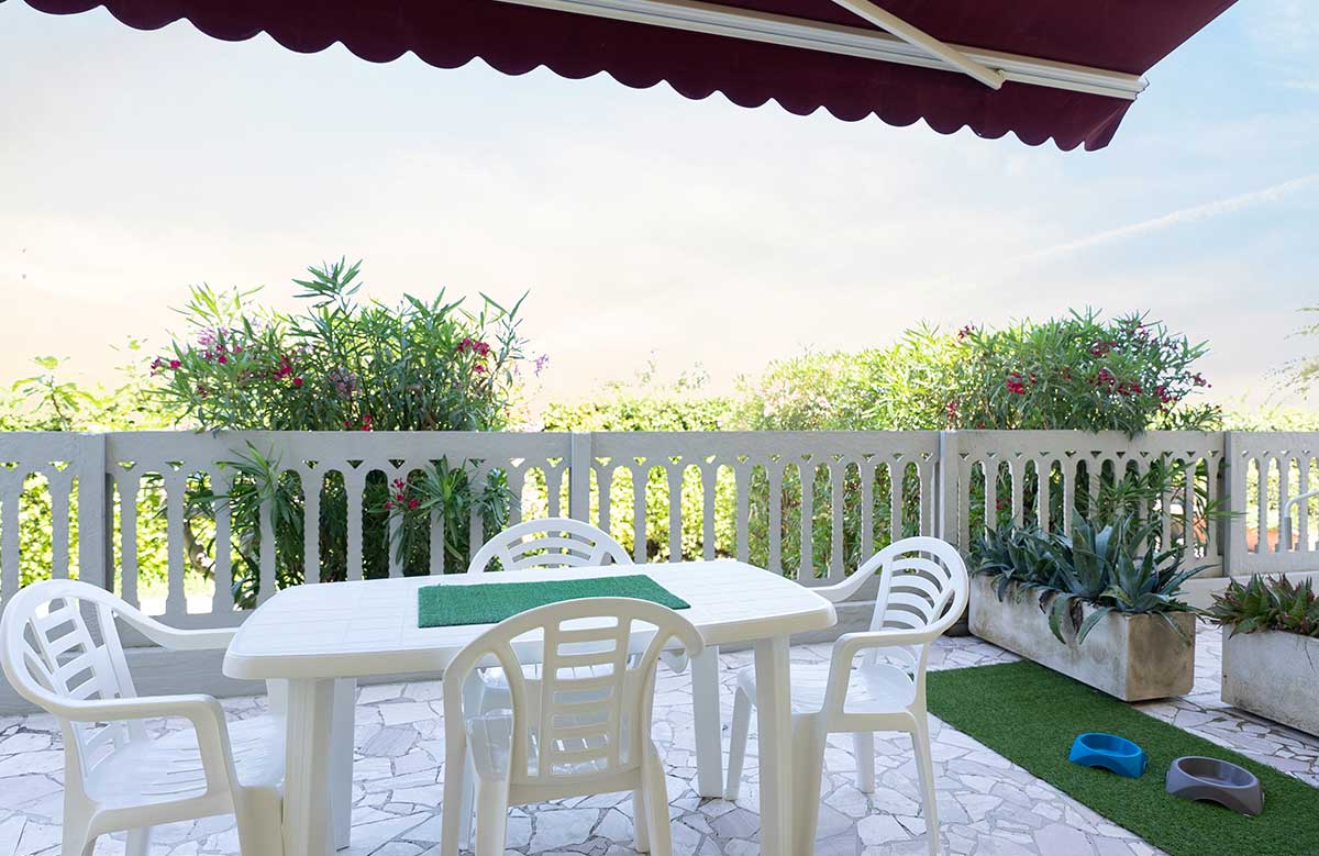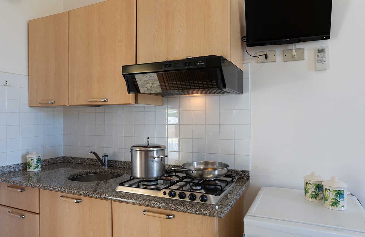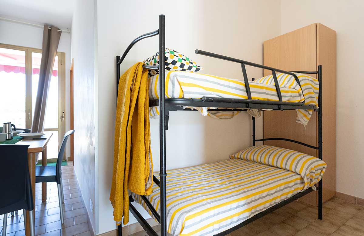 Il bilocale (circa 40 mq) può ospitare fino a 5 persone. E’ composto da una camera matrimoniale, soggiorno con angolo cottura (fornito di posate, stoviglie e pentolame) frigo 80 lt (con scompartimento freezer),1 letto a castello + 1 letto singolo e veranda con tavolo con 2 sedie. Bagno completo di tutti i servizi: lavabo, tenda doccia, bidet, wc.