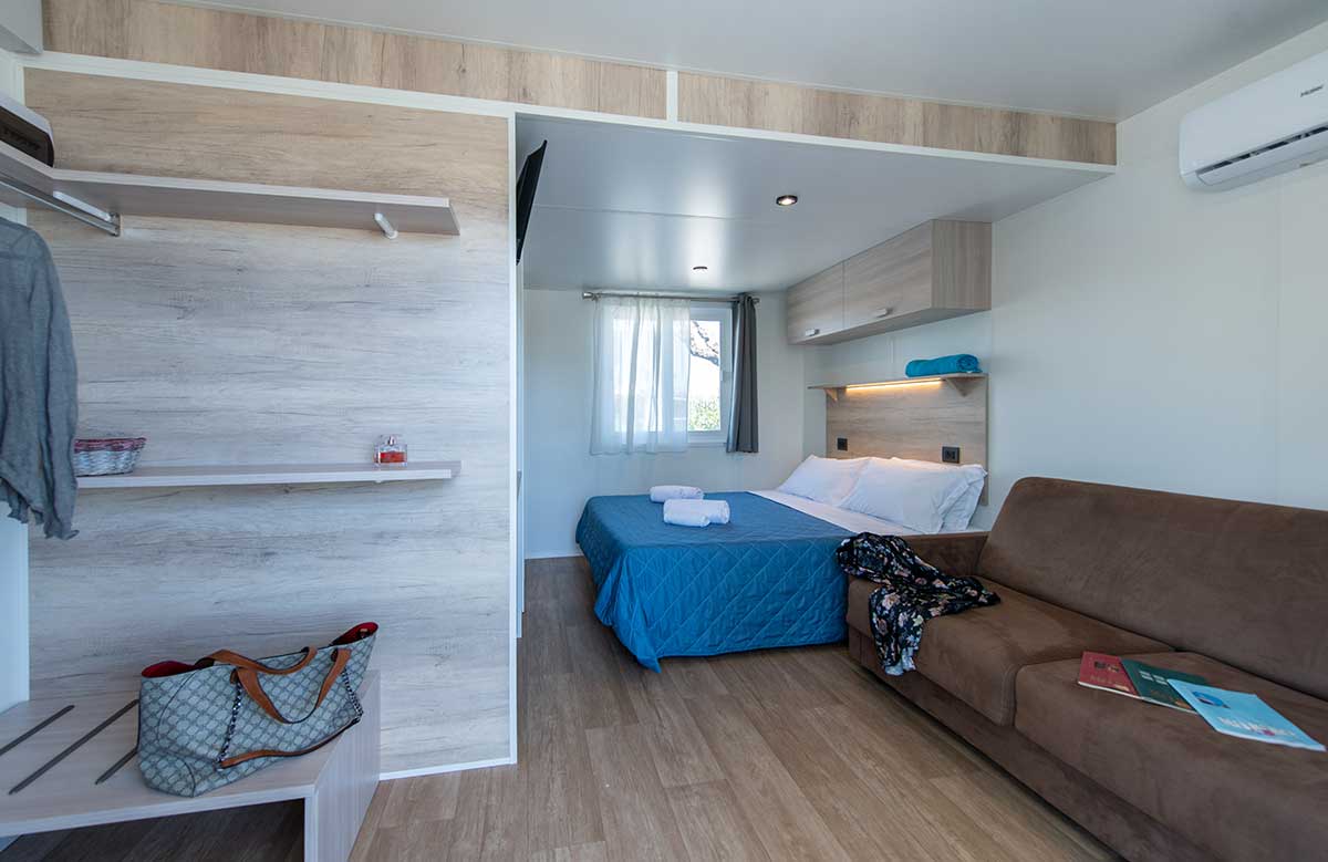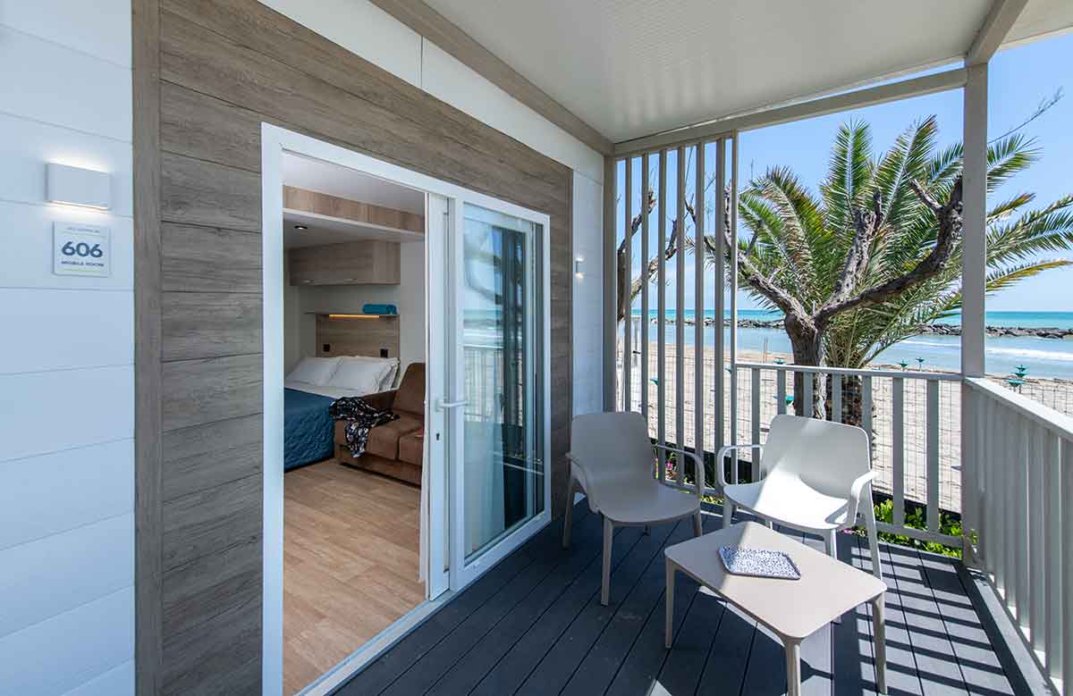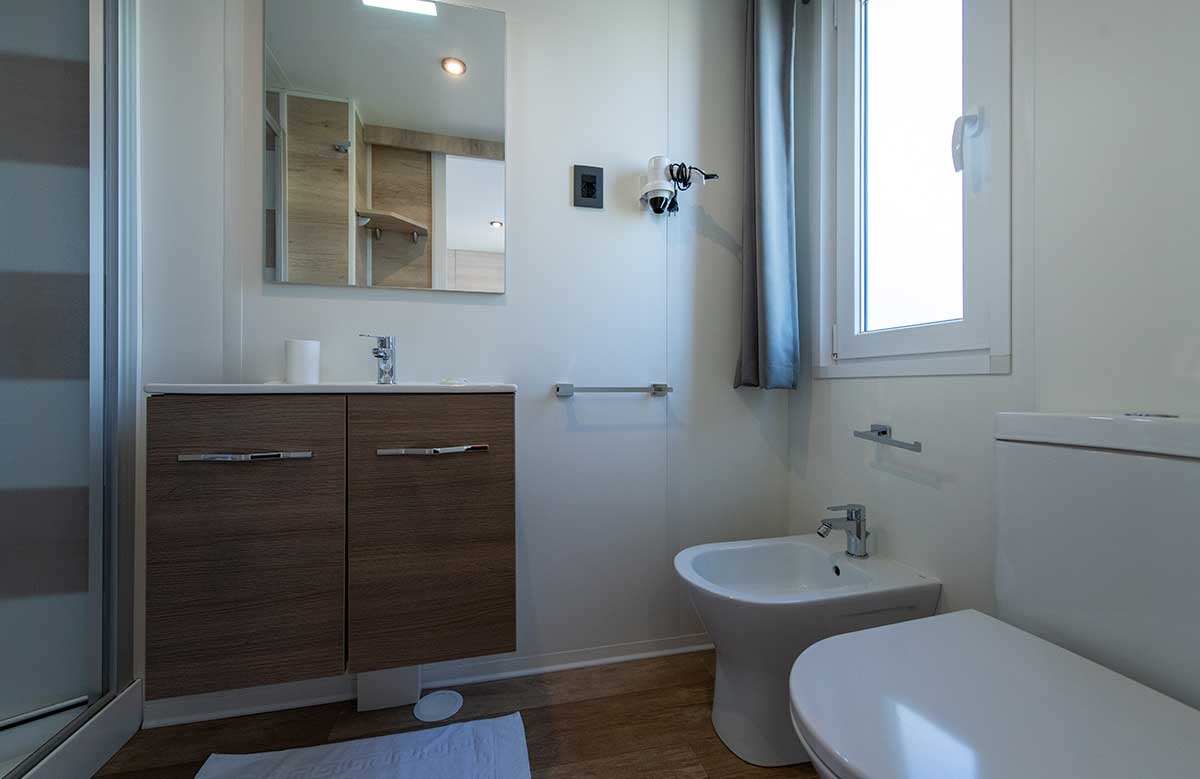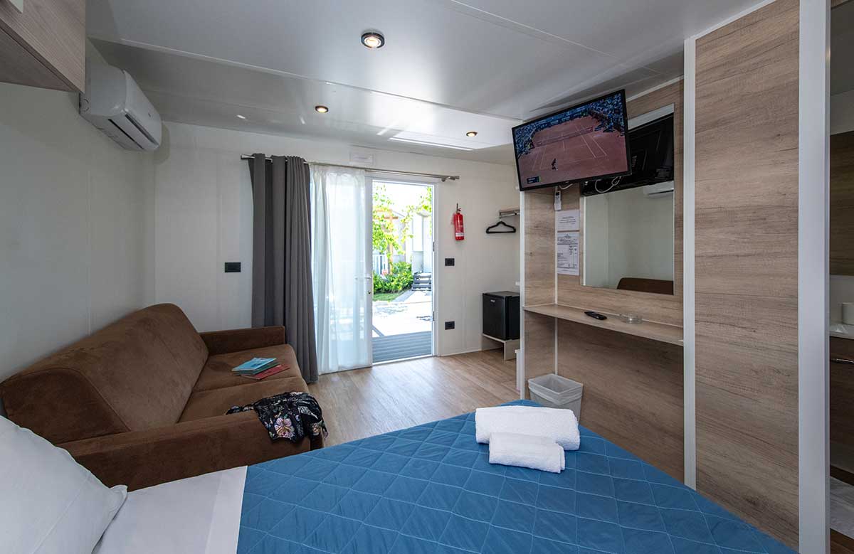 Le nuove Mobile Rooms (circa 25 mq) direttamente al mare, composte da un letto matrimoniale, divano letto 1/2 posti, un bagno completo di tutti i servizi: lavabo, asciugacapelli, cabina doccia, bidet e wc.